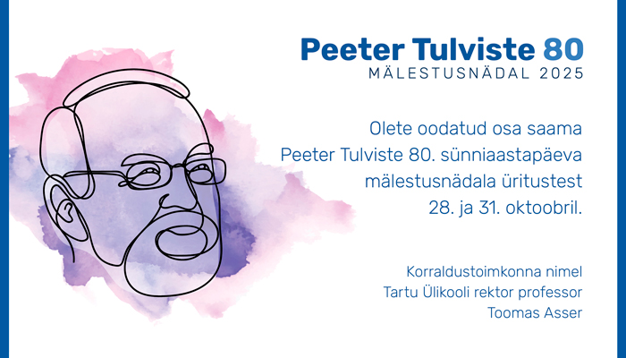 Laadi lõpetamata küsimustik Jätka hiljem vaikimisi Laadi lõpetamata küsimustik Jätka hiljem Hoiatus: JavaScripti käitamine on teie veebilehitsejas selle saidi jaoks või üldiselt keelatud. Kõikidele küsimustele ei pruugi te saada vastust anda. Palun kontrollige oma veebilehitseja parameetreid. Peeter Tulviste 80 mälestusnädalale registreerumine 27. oktoobrist 2. novembrini toimub professor Peeter Tulviste 80. sünniaastapäeva puhul mälestusnädal. Palun registreeruge hiljemalt 20. oktoobril. (See küsimus on kohustuslik) Osalen: Palun valige kõik sobivad variandid järgmistest valikutest. 28. oktoobril kell 16.15 Peeter Tulviste mälestustseremoonia Raadil, Vana-Jaani kalmistul 28. oktoobril kell 17.15 näituse „Bibliofiil Peeter Tulviste“ avamine Tartu Ülikooli raamatukogu Äksi saalis 31. oktoobril kell 11.30 mälestuskonverents „Mõtlemist mõtestades“ (See küsimus on kohustuslik) Ees- ja perekonnanimi (See küsimus on kohustuslik) E-posti aadress (See küsimus on kohustuslik) Asutus või üksus Esita
